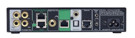 Zona audio Hi-Res, sia con audio locale che distribuito (ingressi ed uscite digitali e analogici). Ingressi: 1x S/PDIF a 2ch. (96 kHz e fino a 24 bit) 1x Speakerlink a 2ch. (96 kHz e fino a 24 bit) 1x Toslink a 2ch. (96 kHz e fino a 24 bit) 1x analogico a 2ch 1x ingresso di rete (Ethernet) per la connessione a Meridian, Sooloos Roon o interfaccia di controllo alternativa. Uscite: 2x Speakerlink 1x S/PDIF a 2ch 1x analogica sbilanciata a 2ch (DAC 192 kHz). Controllo: via IP: presa di rete per l'uso con l'app iPad Meridian IP Control, altra interfaccia di controllo Sooloos, Roon e sistemi di controllo di terze parti via IR su jack da 3,5 mm. Dimensioni (AxLxP): 42x204x150 mm. Peso: Standalone: ??0,56 kg. Costruzione: kit rack 1U disponibile con spazio per due unità Staffa di montaggio universale. PSU: Alimentatore ad alte prestazioni: 100 V AC 50/60 Hz | 110-120 V AC 50/60 Hz | 220-240 V AC 50/60 Hz.