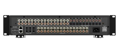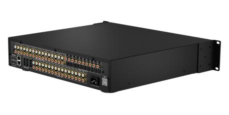 Matrice DSP 16x16 non amplificata per distribuzione audio multi-zona: 16 ingressi sorgente (8 analogici RCA stereo + 8 digitali, 8 coassiali e 8 ottici) e 16 uscite stereo pre-out per collegamento a amplificatori esterni e subwoofer. Routing completo di sorgenti analogiche e digitali verso qualsiasi zona, con loop-out per espansioni e progetti con più chassis. DSP integrato per ottimizzazione (EQ parametrico, filtri, ritardi e gestione livelli) con configurazione da software e controllo via IR; supporta controllo bidirezionale via RS-232/IP quando integrato in un sistema compatibile. Protocollo di comando disponibile sul sito RTI. Dimensioni (LxPxH): 43,7x8,9x41,65 cm; Peso: 8,22 kg