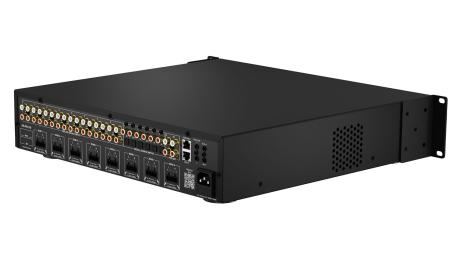 Matrice Amplificata con DSP per distribuzione audio 8x10: 8 ingressi analogici (RCA stereo) e 4 ingressi digitali (4 coassiali + 4 ottici, in mirroring su analog 1–4) con loop-out per espansioni. Gestione di 10 zone totali, con 8 zone stereo amplificate e 2 zone pre-out per amplificazione esterna o subwoofer. Potenza fino a 100 W per canale a 4 O (con carichi e condizioni previste; fino a 75 W/canale con tutti i canali pilotati), 50 W/canale a 8 O e bridging fino a 200 W/canale su carichi idonei. DSP completo con EQ parametrico e funzioni di routing/mixing; controllo tramite RS-232, IP o IR. Dimensioni (LxPxH): 43,7x8,9x41,65 cm; Peso: 10,78 kg