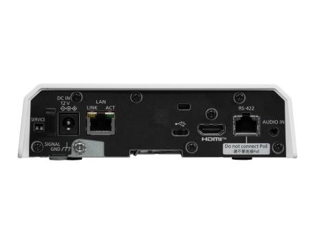 Installabile anche a soffitto, 4K MOS da 1/2,5" sensibilità min 3 lux, stabilizzatore d'immagine. Ottica zoom 24x, i.Zoom UHD 28x (FHD 36x), digital extender zoom 1.4x e 2x. Messa a fuoco min 10 cm (wide) 1.2 m (tele), messa a fuoco Auto o Manual. Angolo visione orizzont. 74.1° (wide) 3.3° (tele). Pan/Tilt: orizzontale ±175° (velocità max 90°-180°/s), verticale 30°+90° (max velocità 90°-180°/s). Risoluzioni: 3840x2160 (max 29,97p/25p solo HDMI), 1920x1080 (max 59,94p/50p su SDI/HDMI streaming), 1280x720 (max 59,94p/50p). Guadagno manuale o automatico da 0 a +42 dB. Velocità shutter da 1/24 a 1/10.000 s. Uscita video: 3G-SDI (2K), HDMI (4K), USB-C. Ingresso audio Mic e Linea. Controllo tramite: protocollo RS-422 (RJ45), LAN IP (RJ45), web browser, USB-C. Numero di preset memorizzabili 100. Temperatura di lavoro da 0° a 40° C. Software opzionale per l'auto tracking AW-SF100/AW-SF200. Alimentazione 12 V DC, PoE+ (42-57V). Peso: 1.8 kg. Dimensioni (WxHxD): 160x192x166 mm. Colore: bianco.