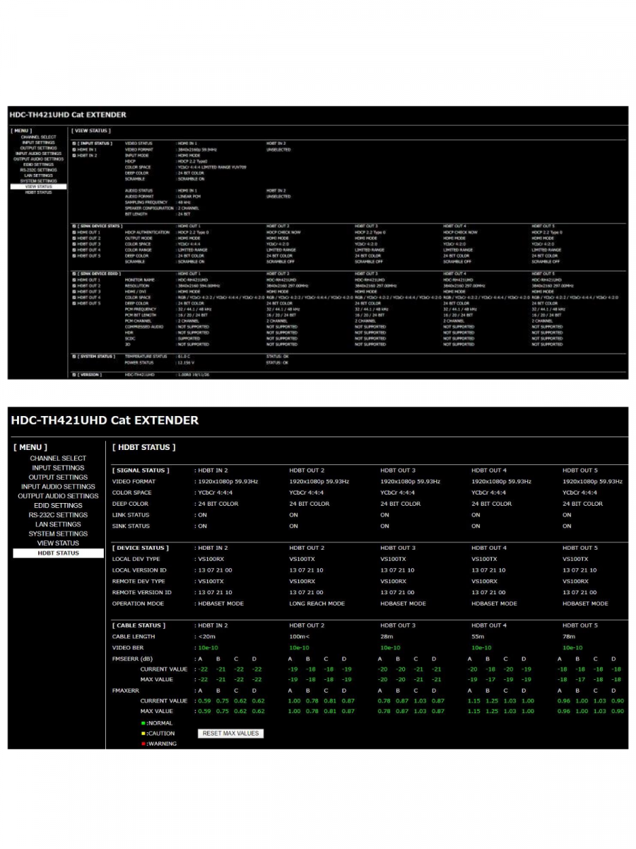 La prima monitora i parametri dei segnali in transito sia sulle porte di ingresso che di uscita ma anche le informazioni EDID degli apparati Sink connessi alle uscite.