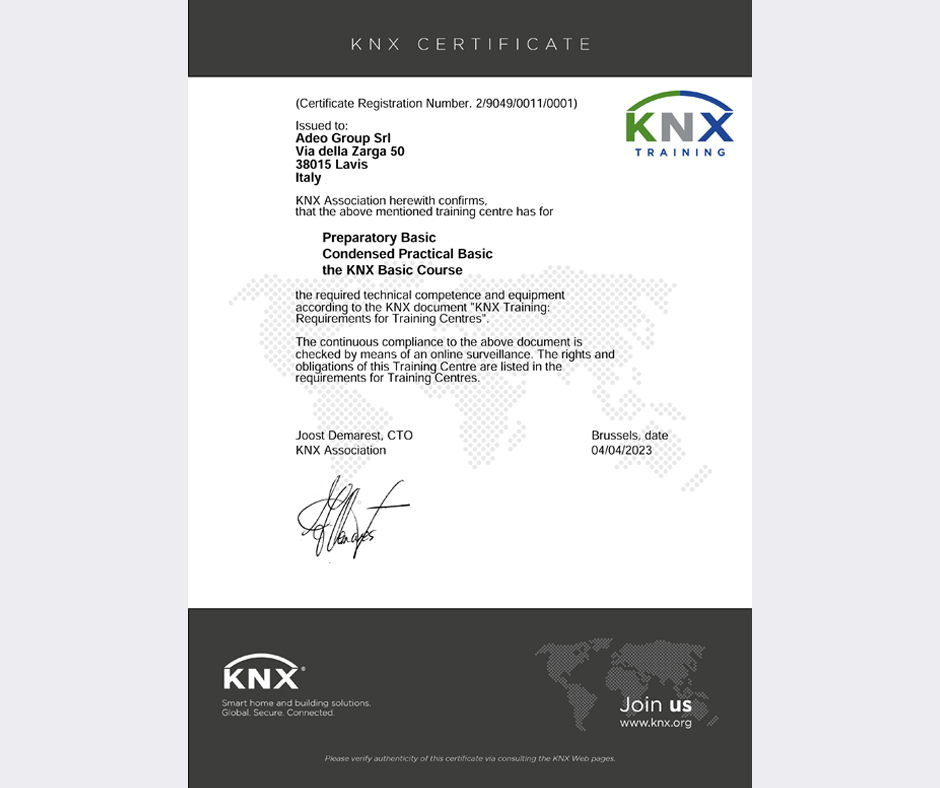 L'associazione internazionale KNX ha ufficialmente conferito il certificato di Training Center KNX ad Adeo Group.