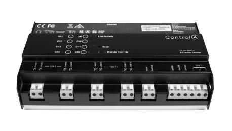 Modulo dimmer a fase adattiva per il controllo fino a 3.840 W con uno/due circuiti di alimentazione. Sono supportati i seguenti tipi di carico: ad incandescenza, alogene, elettroniche con trasformatore a basso voltaggio (ELV), con trasformatore magnetico a basso voltaggio (MLV), fluorescenti, fluorescenti compatte, LED. N.B: Per motori, o altri utilizzi diversi da connessioni a luci, consigliamo di utilizzare il modulo relè a 8 canali Control4 C4-DIN-8RELSW-E. Dotato di pulsanti frontali per le operazioni di on/off sul carico, pulsante di reset, pulsante override, ingresso switch per la connessione a pulsantiera esterna per la funzione di override. Dispone di 2 porte RJ45 LAN. Dimensioni (HxWxD): 219x115x57 mm (12M). Peso: 1,2 kg.