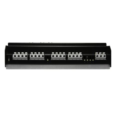 Modulo relè per il controllo di motori, tende, serramenti o luci. Ogni canale supporta fino a 16 A, pulsanti frontali per le operazioni di on/off sul carico, pulsante di reset, pulsante override, ingresso switch per la connessione a pulsantiera esterna per la funzione di override. Dispone di una connessione RJ45 LAN e una porta RJ45 lan aggiuntiva per collegamento a catena in rete, 4 circuiti di alimentazione. Dimensioni (HxWxD): 215x109x57 mm. Peso: 1,3 kg.