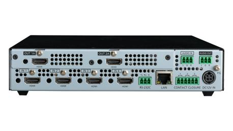 Doppio scaler indipendente multi ingresso 4 HDMI + 1 audio stereo, 2 uscite HDMI + 1 audio stereo, max risoluz. 4K @60 4:4:4 HDCP 2.2. Commutaz. seamless, PiP/PbyP, le 2 uscite possono essere anche usate per ottenere una visualizzazione a canvas unificato, con visualizzazione libera di 1 finestra o max 2 finestre PiP su 2 visualizzatori. Auto switch, audio breackaway, memoria logo, contr. aspect ratio, test pattern generator, contr. EDID audio/video, Anti-snow, Connection reset, contr. totale audio in/out + lip sync + analog audio out. Memorie: Crosspoint (9), Preset (9), Pattern (5), last use. Connessioni: 4 IN e 2 OUT HDMI (4K @60 4:4:4), 4 IN audio (HDMI) + 1 IN e 1 OUT audio stereo sbilanc. Controllo 1 RS-232, 1 LAN, 3 OUT chiusure contatti. Controllo apparati terze parti con macro (64) RS-232, LAN, CEC, contatti. Pann. frontale: tasti retro illuminati, display VFD, contr. totale da menù navigabile. Controllo: pann. frontale, RS-232, LAN (web). Dimensioni (WxHxD): 210x42x250 mm, 1/2 Ur. Peso: 1,8 kg. Alimentatore esterno multi tensione 12 V 2,6 A.