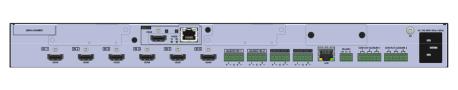Singolo scaler multi ingresso 6 HDMI + 2 audio stereo, 1 uscita parallela 1 HDMI + 1 HDBaseT + 2 audio stereo, max risoluz. 4K @60 4:4:4 HDCP 2.2. Espansioni opzionali: 1 ingresso HDBaseT o SDVoE (CAT o Fibra), scheda audio Dante I/O. Commutazione seamless, PiP/PbyP, auto switch, audio breakaway, memoria logo, controllo aspect ratio, test pattern generator, controllo EDID audio/video, Antisnow, Connection Reset, gestione totale audio in/out + lip sync + analog audio out. Memorie: Crosspoint (9), Preset (9), Pattern (5), last use. Connessioni: 6 IN e 1 OUT HDMI + HDBaseT (RJ45), 6 IN audio (HDMI) + 2 IN e 2 OUT audio stereo bilanc. 1 slot espansione ingresso video (IN6), 1 slot espansione scheda Dante. Controllo 1 RS-232, 1 LAN, 6 out chiusure contatti. Controllo apparati terze parti con macro (64) RS-232, LAN, CEC, contatti. Pann. Frontale: tasti retro illuminati, display VFD, contr. Totale da menù navigabile. Controllo: pann. Frontale, RS-232, LAN (web). Dimensioni (WxHxD): 430x44x350 mm, 1U. Peso: 4,5 kg. Alimentatore integrato multi tensione 54 W.