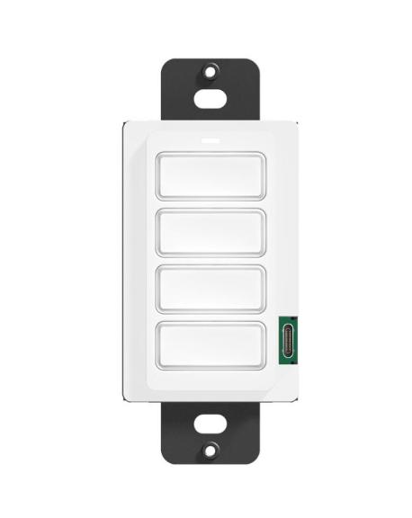 Tastierino da parete con 4 tasti completamente programmabili, pensato per un controllo rapido e locale di luci, musica, tende e scenari. Alimentazione e comunicazione via Ethernet (PoE) per cablaggio semplificato; feedback a due vie tramite retroilluminazione con colore configurabile per ogni tasto. Compatibile con scatola US single-gang e placche stile Decora®; programmazione via rete o USB. Fornito con due set completi di placca e cappucci tasto (bianco e nero). Dimensioni (LxPxH): 4,6x4,3x10,4 cm; Peso: 0,11 kg