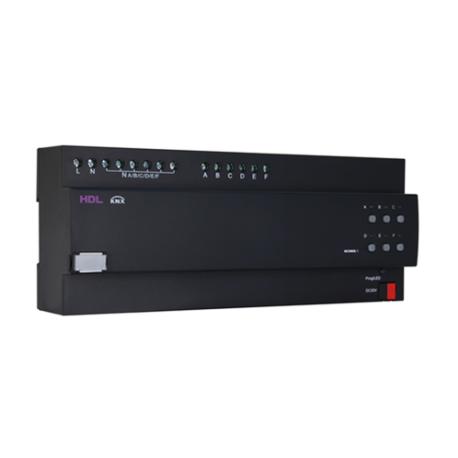 Dimmer 6CH 1.5 A Trailing Edge, montaggio su guida DIN, 1.5 A per canale e totalmente 9 A, entrambi 110/220 V AC, 50-60 Hz, Indicatore di stato a LED e pulsante di bypass per ciascuna uscita. I canali paralleli possono formare un'uscita di corrente elevata.