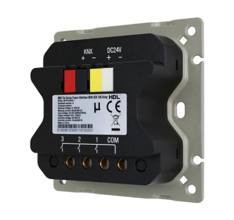 Interfaccia di alimentazione serie Tile EU con relè 3CH 10A, tensione di ingresso: AC 100-240 V (50/60 Hz), ingresso alimentazione ausiliaria: 10 mA/24 V DC, uscita relè di chiusura magnetica 3CH 10 A, premere a lungo il pulsante di programmazione per settare tutti i canali relè on/off, fornisce alimentazione CC e comunica con il pannello a parete HDL Tile Series, conforme alla scatola incasso di dimensioni 86x86 mm.