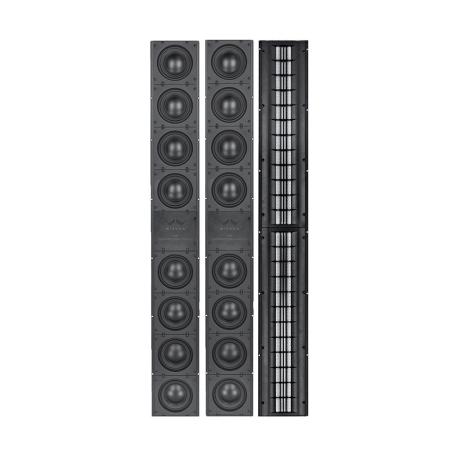 Set di diffusori da incasso a parete con woofer SAGE ad alte prestazioni. Composto da 2 diffusori per le Medie/basse frequenze con 8 mid/bass woofer da 6" ciascuno e 1 per le alte frequenze con 2 driver planari magnetici da 24" (61 cm) di lunghezza ciascuno. Impedenza nominale diffusore mid/bass di 4 ohm e diffusore high planare di 4.5 ohm. 1000 W di potenza di picco. 95 dB di sensibilità e risposta in frequenza da 30 Hz 20 kHz. Sono richiesti 5 ch di amplificazione, 2 per ciascun diffusore mid/bass e 1 per il diffusore ad alte frequenze. Dimensioni: 130x20.5x9.6 cm (AxLxP) ciascuno. Peso diffusore mid/bass: 28 kg ciascuno. Peso diffusore high freq. Planare: 14.5 kg.
