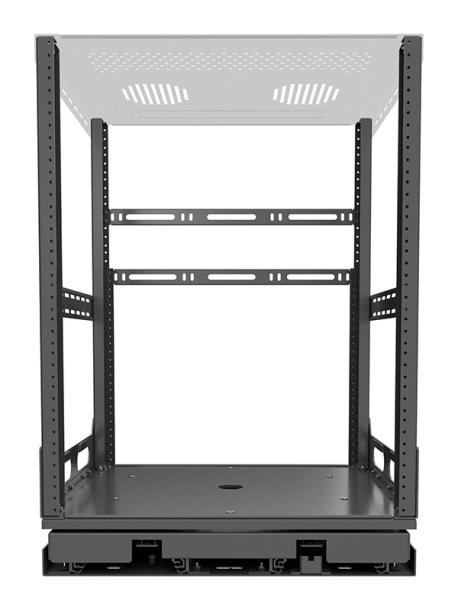 La ventilazione è assicurata da pannelli forati o griglie laterali e frontali che favoriscono il ricircolo naturale dell’aria per prevenire il surriscaldamento. È possibile integrare ventole per una ventilazione attiva in caso di carichi termici elevati. La copertura superiore (STRONG SR-CAB-SLIDE-TOP) non è inclusa e può essere ordinata separatamente.