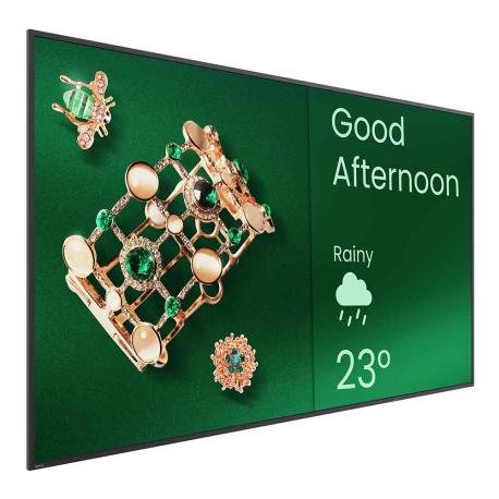 Pannello LCD tipo ADS, illuminazione Direct-LED, Android 14.0, operatività 18/7, orientamento landscape/portrait, compatibile con X-Sign, memoria interna 4/32 GB. Contrasto 1200:1, speaker 12+12 W, angolo di visione 178°/178°, vita approssimativa 30.000 ore. Ingressi: 2 HDMI, 1 minijack audio out, 2 USB, LAN RJ45, RS-232. VESA 400x200, consumo 71 W. Dimensioni (WxHxD): 1234x707x59 mm. Peso: 14,7 kg. Finitura nera.