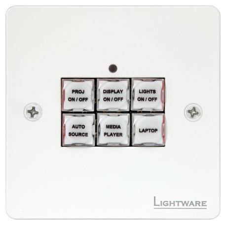 Pannello di controllo con 6 pulsanti programmabile con software Event Manager attraverso GPIO. Compatibile con wall mount e box esterne Europee. Connettori 1x 8-pole Phoenix for GPIO (7x GPIO, 1x GND), 6 pulsanti retrolluminati con etichetta customizzabile. Dimensioni (WxHxD): 80x 80x20,8 mm. Peso: 100 grammi. Colore: bianco.
