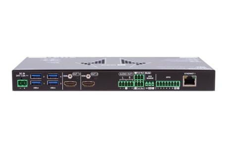 Matrice ideale per meeting rooms e spazi collaborativi, silenziosa senza ventole. Permette di gestire segnali video HDMI, integra uno switch USB in grado di gestire apparati USB (come webcam, soundbar, touch screen ecc.) e condividerli verso i PC (host). Supporta segnali con risoluzione max 4K @60 4:4:4. Dotato di 2 ingressi e 2 uscite HDMI 2.0 HDCP 2.2. Switch USB 3.1 dotato di 4x USB-A per apparati USB, porte per PC host 1x USB-B e 1x USB-C (solo dati no video). Sono presenti connessioni 1x mini USB Tipo B (di servizio per aggiornamenti), 1x USB Type-A (per sviluppi futuri). Audio de-embedder e pass-through, uscita stereo bilanciata. Porte controllo 1x LAN (RJ45), 2x RS-232, 6x GPIO, 1x sensore presenza. Funzioni avanzate di controllo e automazione (integrazione con LARA). Dimensioni (WxHxD): 246 26x150 mm.