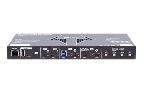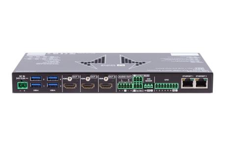 Matrice ideale per meeting rooms e spazi collaborativi, silenziosa senza ventole. Permette di gestire segnali video HDMI e USB-C, integra uno switch USB in grado di gestire apparati USB (come webcam, soundbar, touch screen ecc.) e condividerli verso i PC (host). Supporta segnali con risoluzione max 4K @60 4:4:4. Dotato di 2 ingressi e 3 uscite HDMI 2.0 HDCP 2.2 + 2 ingressi USB-C (4K Video, Audio, Dati, LAN, Alimentazione). Switch USB 3.1 dotato di 4x USB-A per apparati USB, porte per PC host 1x USB-B e 1x USB-C (solo dati no video) e condivisione dati verso le 2 porte USB-C video. Sono presenti connessioni 1x mini USB Tipo B (di servizio per aggiornamenti), 1x USB Type-A (per sviluppi futuri). Audio deembedder e pass-through, uscita stereo bilanciata. Porte controllo 1x LAN (RJ45), 2x RS-232, 6x GPIO, 1x sensore presenza. Sono presenti ulteriori 2 porte LAN configurabili per gli utenti. Funzioni avanzate di controllo e automazione (integrazione con LARA). Dimensioni (WxHxD): 246x26x150 mm.